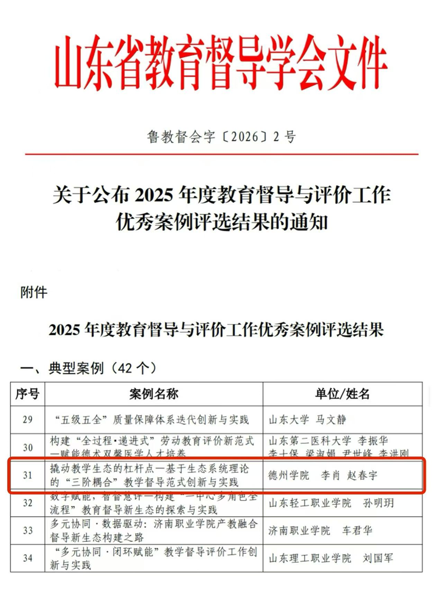 近日,山东省教育督导学会发布《关于公布2025年度教育督导与评价工作优秀案例评选结果的通知》(鲁教督会字〔2026〕2号),经资格审查、专家评审和评委会会审,全省共评选出典型案例42个、优秀案例133个。我院教学督导组撰写的《撬动教学生态的杠杆点:基...