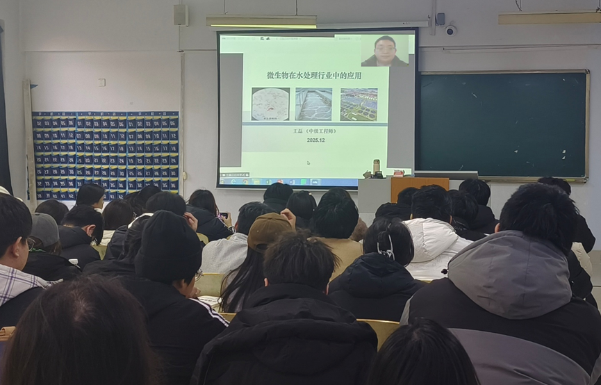 为搭建校企协同育人桥梁,帮助环境生态工程专业学生深化对水处理行业中环境微生物学应用的认知,切实提升理论联系实际的能力,2025年12月26日,生态与资源环境学院邀请北京绿邦环保工程有限公司王磊工程师开展主题为“微生物在水处理行业中的应用”的专题讲座。环境生态工程专业师共同参加,讲座由我院“环境微生物学”课程教师刘洋主持。