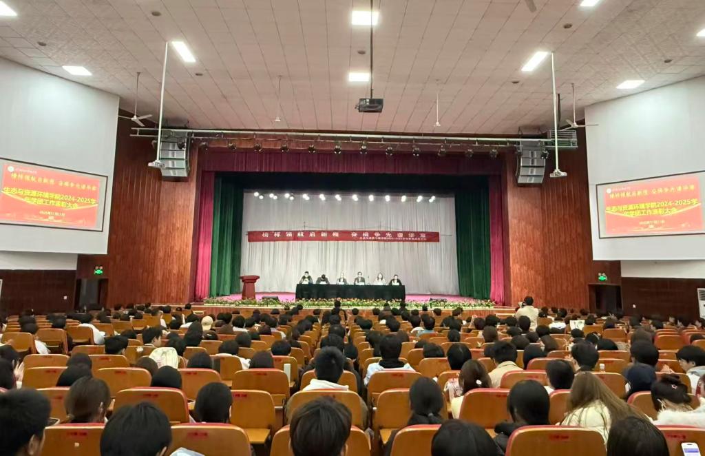 为充分发挥先进典型的示范引领作用,激励全院学生勤学向上、争先创优,生态与资源环境学院于11月11日晚上在南丁格尔报告厅举办2024—2025学年学团工作表彰大会。学院领导班子成员、全体辅导员、班主任以及2025级全体新生参加了本次大会。