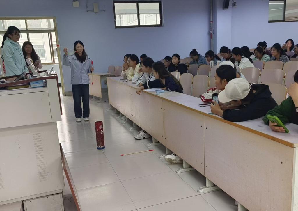 活动中,同学们以4人一组参与三项民族体育项目。汉族投壶赛里,各组在3米指定线后投箭,工作人员讲解其源于先秦宴饮礼仪的文化背景;壮族丢“绣球”接力赛中,2名抛球者和2名接球者协作,抛球者在5米处投球接力,工作人员介绍其改编自壮族“三月三”丢绣球习俗的寓意;傣族跳房子竞速赛则考验队员速度,工作人员讲解格子图案的傣族民俗文化。
