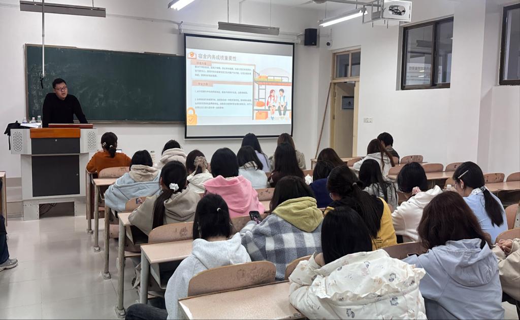 宣讲中,公寓部成员首先从同学们个人成长与校园文明建设角度出发,结合校规深入阐释宿舍卫生成绩的重要性,让同学们清晰认识到宿舍内务并非“小事”,扭转同学们“打扫卫生就是应付检查”的错误认知。随后,成员围绕宿舍安全防护与内务整理开展实用科普与指导。安全方面,结合典型案例警示违规用电、私拉乱接等危害,讲解防范与应急技巧。内务方面,明确床铺整理、物品摆放及卫生要求,并耐心解答学生提出的疑问,让规范要求更易理解、更易落实。