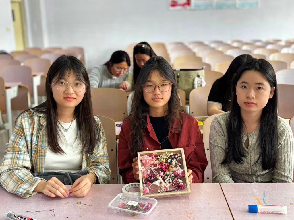 活动现场,协会负责人先行介绍活动流程、相关注意事项,细致讲解干花搭配技巧与手工制作方法。随后同学们领取干花、相框、胶水等材料,自由构思创意,用心搭配花草布局,认真粘贴固定。大家尽情发挥想象力,打造风格各异的专属相框作品,现场氛围轻松融洽。同学们相互交流创意、分享心得,在沉浸式手工创作中放松身心,感受自然美学的独特魅力。